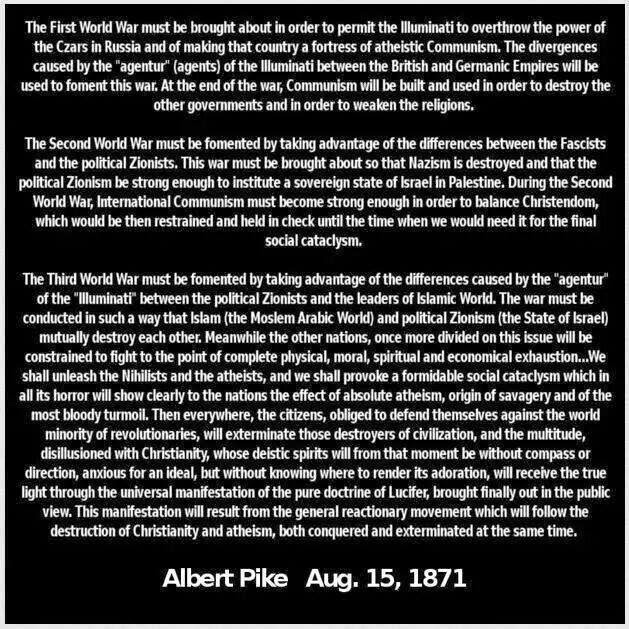 The three world wars were preplanned and are being executed as detailed. Albert Pike wrote a letter to Mazzini, one Freemason to another, dated, August 15, 1871 in which he detailed how they were to achieve their goals of world wars. The Three World Wars were supposedly inspired to Pike by SATAN himself and are being followed by the Zionists to the letter. There has been attempts to discredit the document just like the protocol of The Learned Elders of Zion but one only needs to put two and two together to arrive at the conclusion that Satan has been driving this agenda through his minions. The emergence of the antichrist is drawing nearer and the efforts of the Zionists are intensifying. When we read the blue print of the plans to start the third world war we can clearly see that this document which is from 1871 seems to be predicting our times pretty accurately. With the Zionist Jewish state ready and poised with its nuclear weapons pointed towards the Islamic word. The christian world is pitted against Muslims as aggressors and terrorists all under the guise of war on terrorism. In most cases these acts of terrorisms are false flag conducted by the supposed guardians of the world.